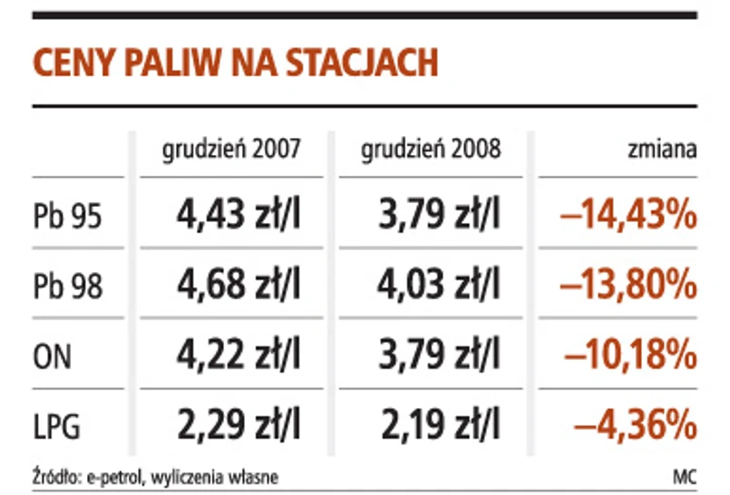 W ubiegłym tygodniu cena ropy naftowej znów spadła poniżej 45 USD za baryłkę. W minioną środę za surowiec z obszaru Organizacji Krajów Eksportujących Ropę Naftową (OPEC) płacono nawet 40,75 USD. Ponad 72-proc. spadek cen w stosunku do lipcowego szczytu notowań (147 USD/b.) to efekt malejącego, po raz pierwszy od 25 lat, globalnego popytu zarówno na surowiec, jak i paliwa. Eksperci nie mają wątpliwości, że przyczyną mniejszego zapotrzebowania na produkty ropopochodne jest kryzys gospodarczy na świecie. Na stacjach benzynowych jest to już odczuwalne.