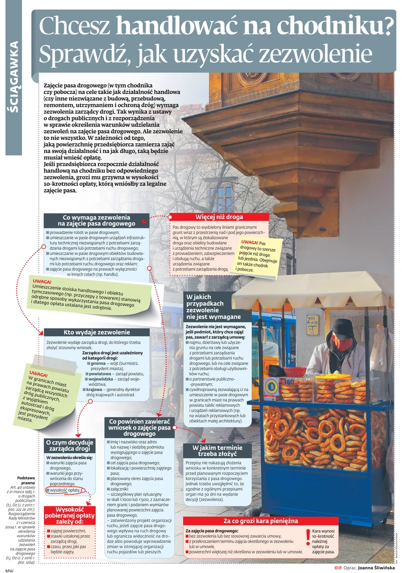 Zajęcie pasa drogowego (w tym chodnika czy pobocza) na cele takie jak działalność handlowa (czy inne niezwiązane z budową, przebudową, remontem, utrzymaniem i ochroną dróg) wymaga zezwolenia zarządcy drogi. Tak wynika z ustawy o drogach publicznych i z rozporządzenia w sprawie określenia warunków udzielania zezwoleń na zajęcie pasa drogowego. Ale zezwolenie to nie wszystko. W zależności od tego, jaką powierzchnię przedsiębiorca zamierza zająć na swoją działalność i na jak długo, taką będzie musiał wnieść opłatę. Jeśli przedsiębiorca rozpocznie działalność handlową na chodniku bez odpowiedniego zezwolenia, grozi mu grzywna w wysokości 10-krotności opłaty, którą wniósłby za legalne zajęcie pasa.