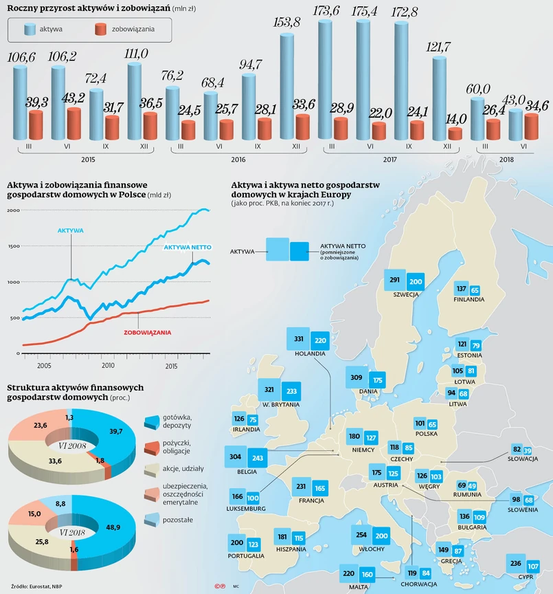 Tylko przez pół roku mogliśmy się cieszyć tym, że aktywa finansowe polskich gospodarstw domowych przekraczają 2 bln zł – w IV kwartale 2017 r. i w I kwartale 2018 r. W II kwartale br. znów spadły poniżej tej bariery – wynika z danych Narodowego Banku Polskiego.