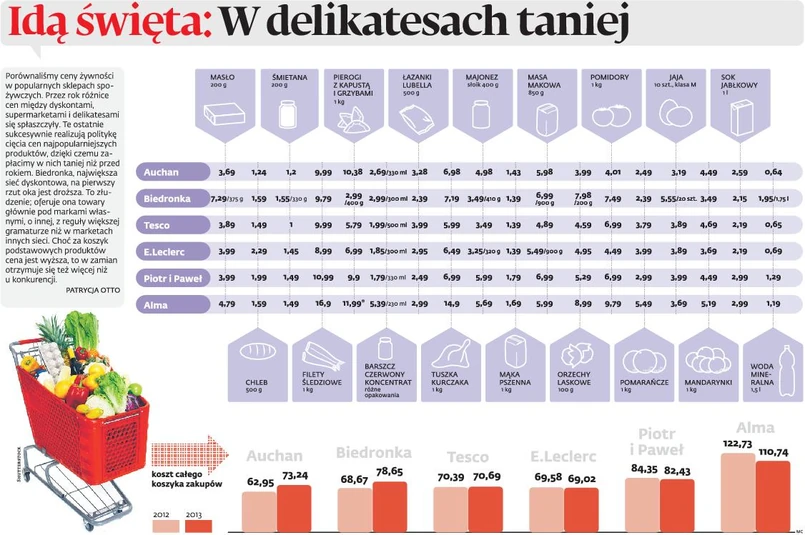 Porównaliśmy ceny żywności w popularnych sklepach spożywczych. Przez rok różnice między dyskontami, delikatesami i supermarketami się spłaszczyły. Te ostatnie sukcesywnie realizują politykę cięcia cen najpopularniejszych produktów, dzięki czemu zapłacimy w nich taniej niż przed rokiem. Biedronka, największa sieć dyskontowa na pierwszy rzut oka jest droższa. To złudzenie: oferuje na towary głównie pod markami własnymi, o innej, z reguły większej gramaturze niż w marketach innych sieci. Choć za koszyk podstawowych produktów cena jest wyższa, to w zamian otrzymuje się też więcej niż u konkurencji.