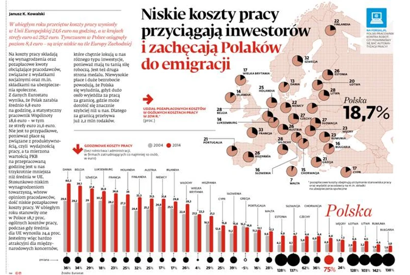 W ubiegłym roku przeciętne koszty pracy wyniosły w Unii Europejskiej 24,6 euro na godzinę, a w krajach strefy euro aż 20,2 euro. Tymczasem w Polsce osiągnęły poziom 8,4 euro - są więc niskie na tle Europy Zachodniej.