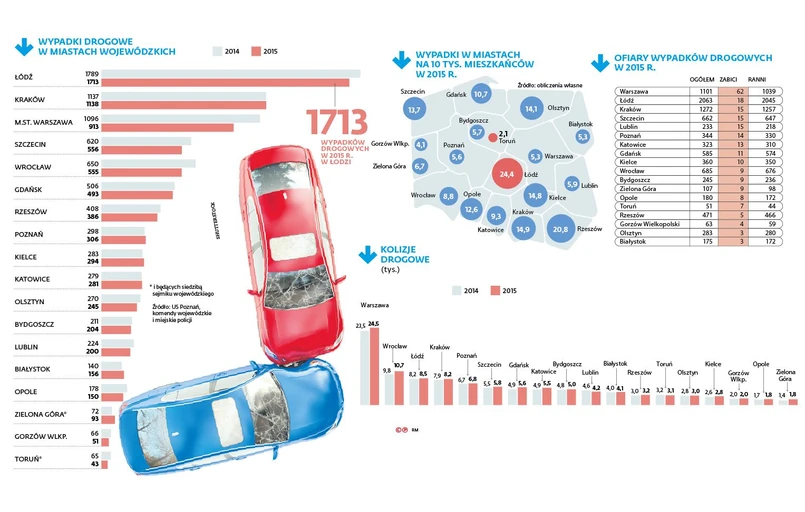 W Warszawie, która jest pod względem liczby ludności ponad dwa razy większa niż Łódź, było w ubiegłym roku 913 wypadków. Stolica jest jednak od lat najbardziej „zabójczym” miastem. W ubiegłym roku w wypadkach zginęły w niej 62 osoby, podczas gdy w Łodzi – 18, a w Krakowie – 15. To pokazuje, że choć w Warszawie jest stosunkowo mało wypadków, to jak już do nich dochodzi, konsekwencje są często tragiczne. Głównie dlatego że w stolicy jeździ się na ogół szybko.